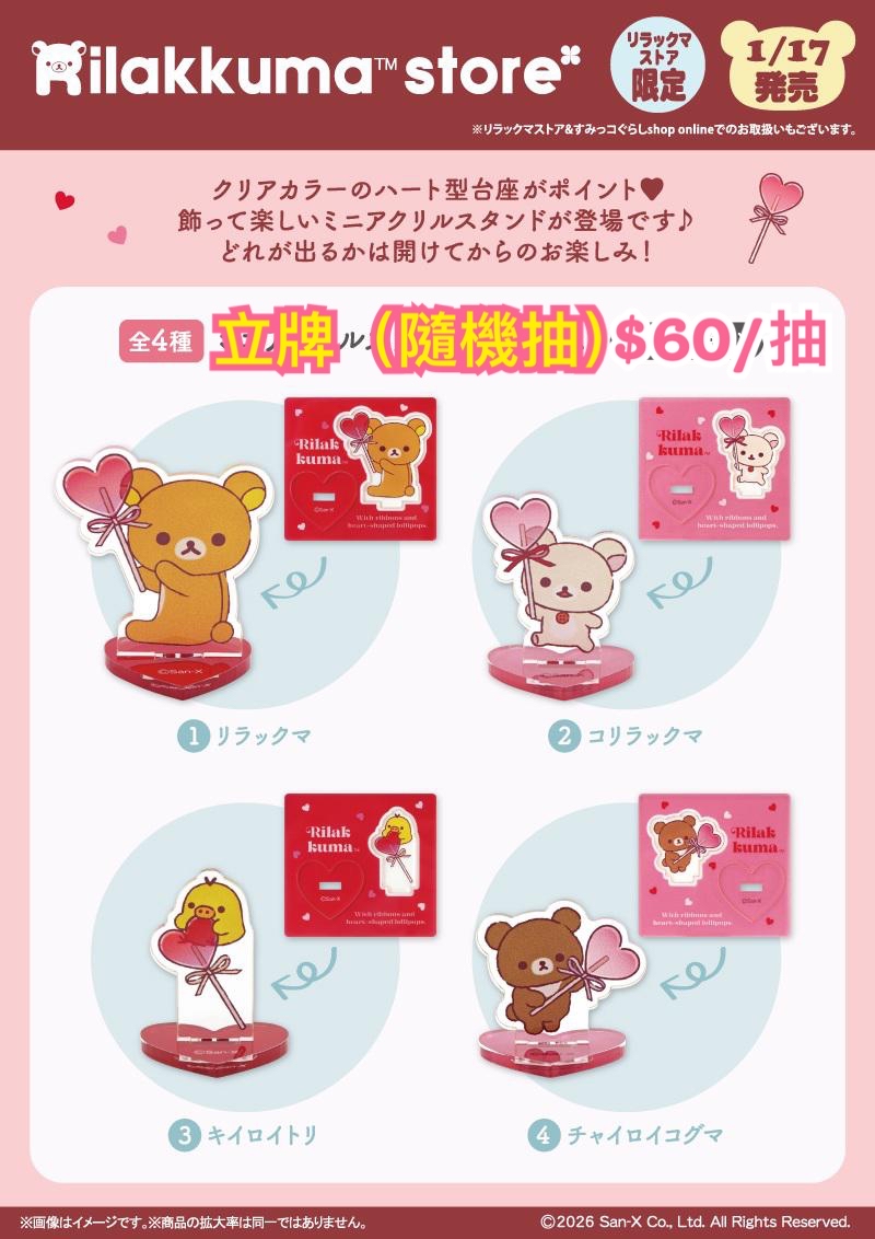 《預訂貨品》全新日本專店限定 Rilakkuma情人節造型立牌(隨機抽) 全4款。接受預訂中 約2026 年2月上旬到貨 ❌留意!如遇缺貨將退回款項!